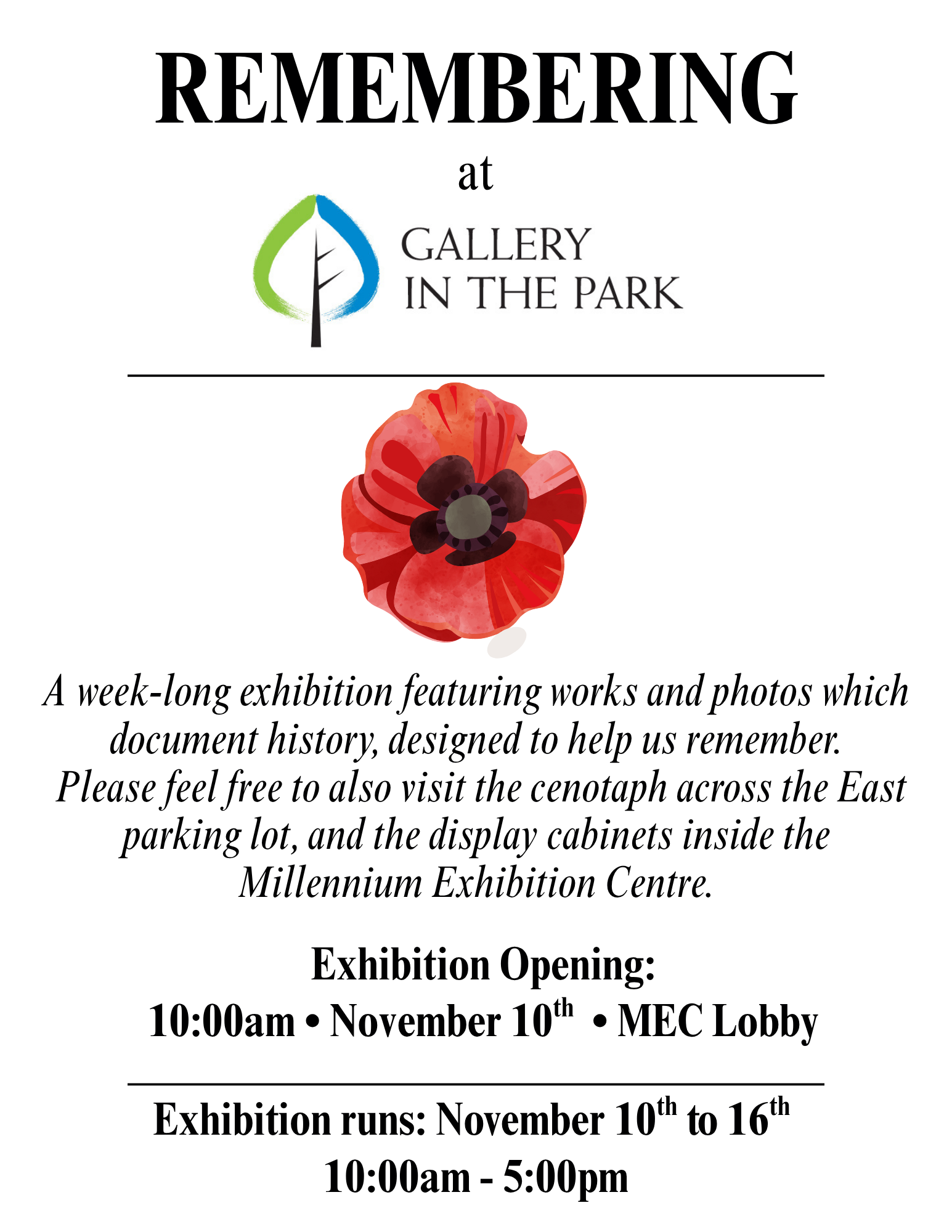 Gallery in the Park welcomes you to attend 'Remembering', a week-long exhibition honouring Remembrance Day.